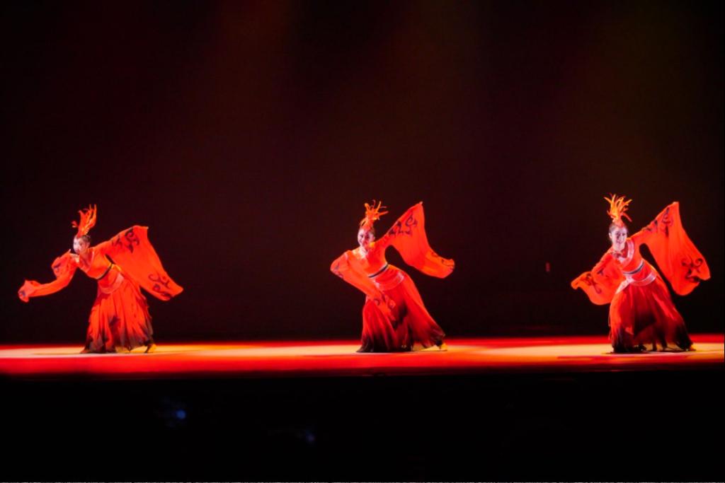 由龚倩、赵丹妮、陈雪懿、文妤皙等编创的三人舞《楚凤飞兮》率先登台。作品以楚文化中的楚凤为灵感源泉,巧妙融合了楚凤神秘、灵动与壮丽的特质,以三头凤图案贯穿创作始终。舞者们凭借灵动的舞姿,将楚地人民对美好生活的向往以及对自由、高贵精神的颂扬展现得淋漓尽致,深刻诠释了对传统文化的热爱与传承。