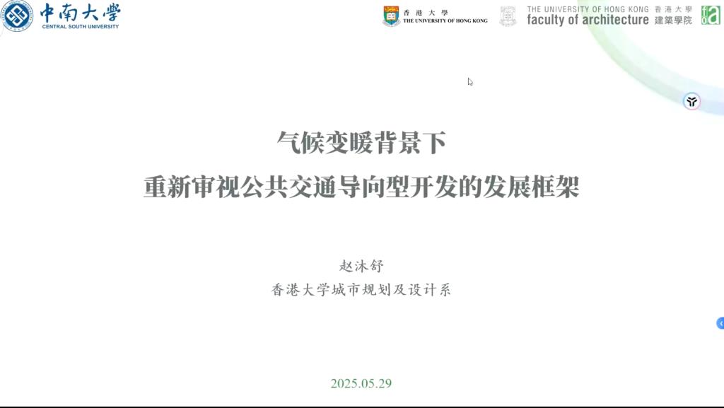 5月29日下午,九色 《城市生态与环境研究及实践》博士生课程学术分享活动在天心校区第二综合楼604成功举行。香港大学城市规划及设计系在读博士赵沐舒应邀做主题分享,聚焦“气候变暖背景下重新审视公共交通导向型开发”。本次分享活动由城乡规划系课程负责人张安琪讲师策划组织,该系博士生及研究生代表参与讨论交流。