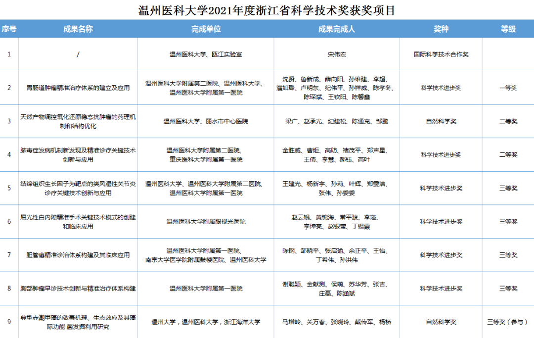 7月11日,全省科技创新大会在省人民大会堂举行。大会颁发2021年度浙江省科学技术奖306项,我校及附属医院共获一等奖1项,二等奖2项,三等奖5项(含参与1项)其中沈贤教授团队项目成果“胃肠肿瘤精准诊治关键技术创新和应用”获省科学技术进步奖一等奖。宋伟宏院士获浙江省国际科学技术合作奖。