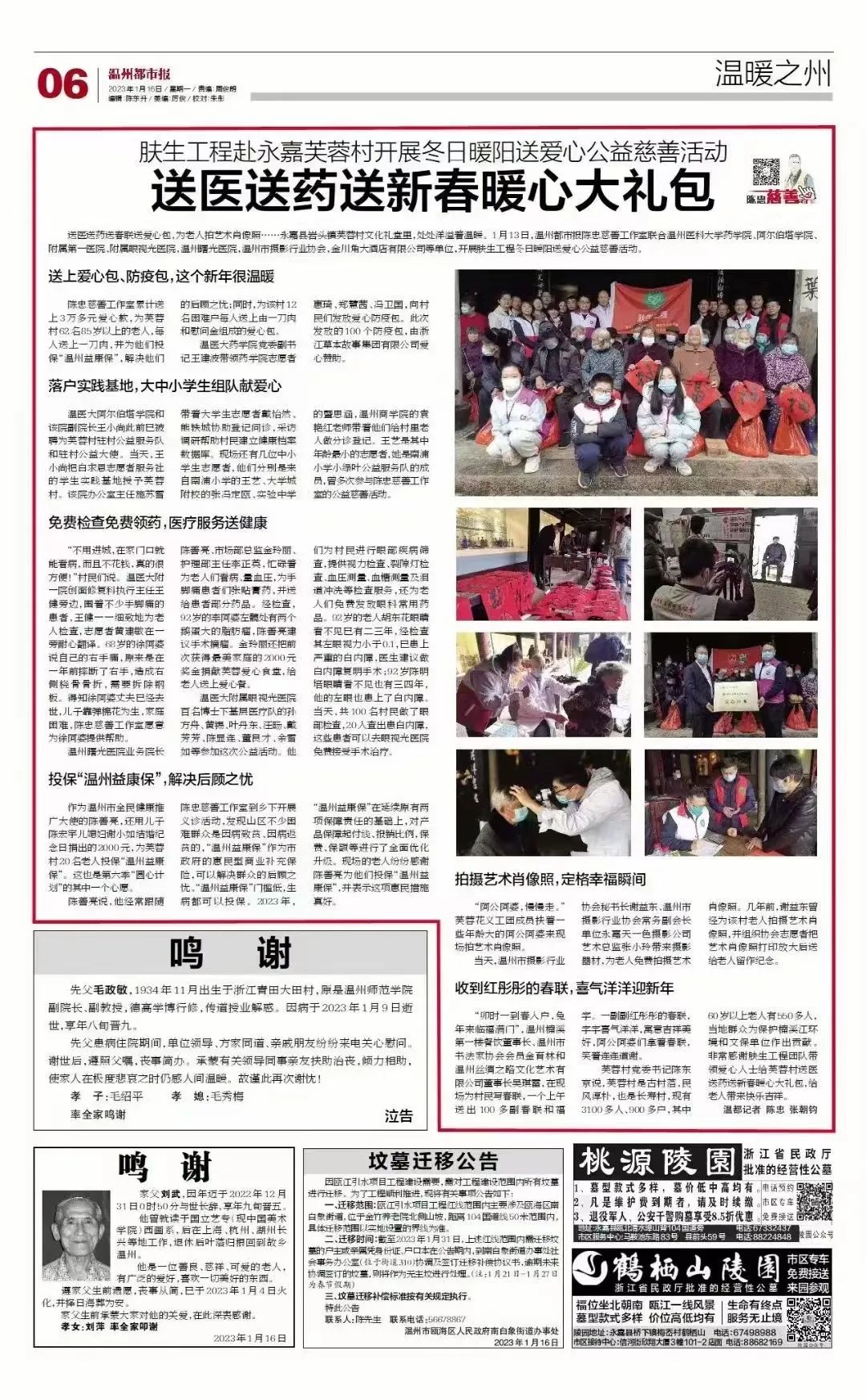 寒假期间,我院白求恩志愿者服务社赴永嘉县芙蓉村参加“肤生工程”爱心义诊活动,与学校药九色、附属第一医院、第二医院、眼视光医院,温州都市报陈忠慈善工作室、温州曙光医院、温州市摄影行业协会的专家一道,为当地群众送医送药送健康,送上新春的第一抹温暖。