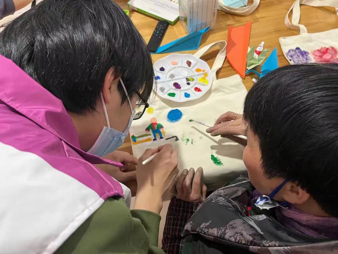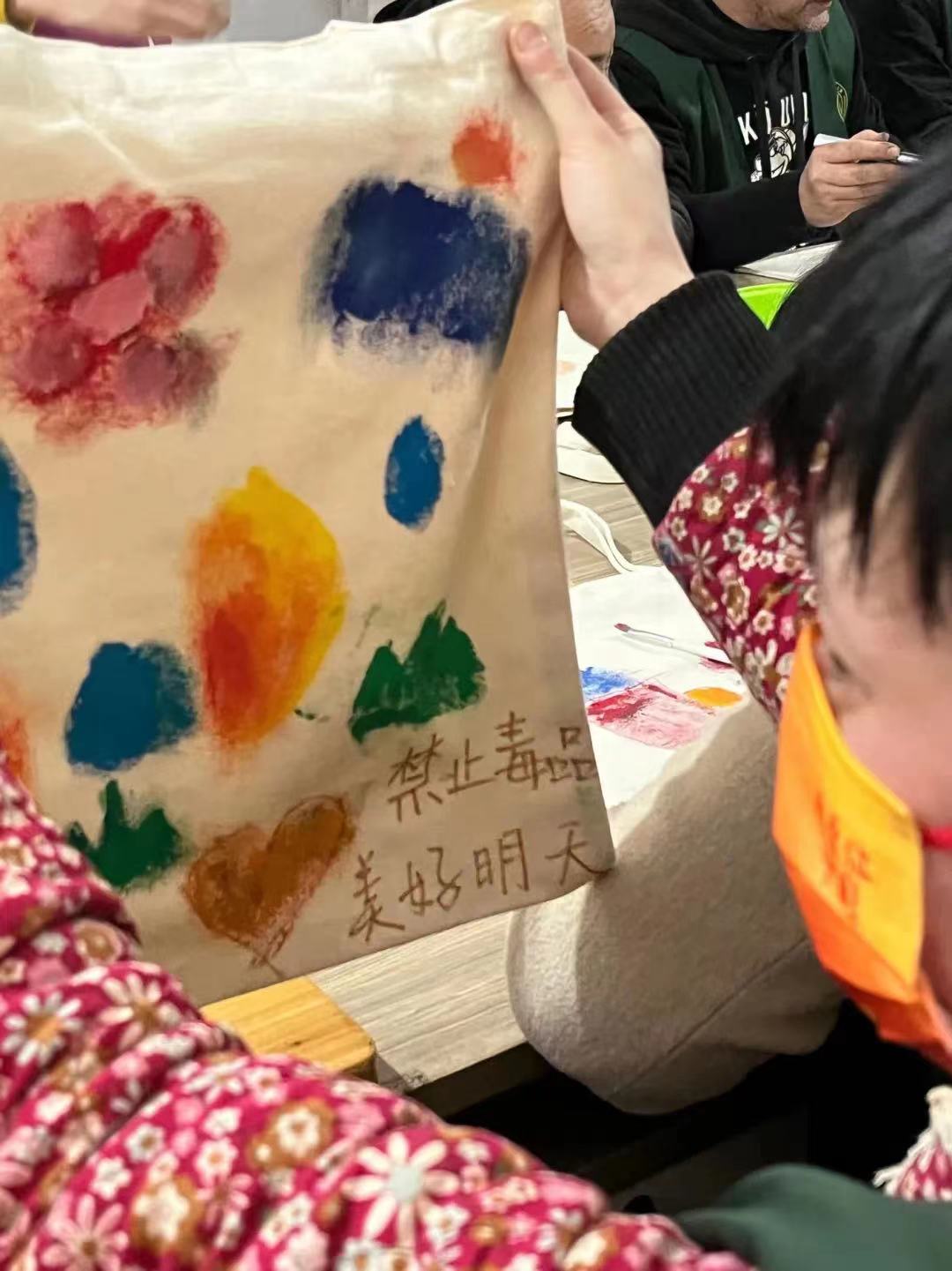 随后,志愿者为残疾人们播放禁毒视频并和他们一起在帆布袋上绘制有关禁毒的图案,帆布袋也作为礼物赠送给了残疾人之家的各位学员。在轻松愉悦的氛围里,他们不仅自身接触了解了禁毒知识,也为禁毒宣传献出了一份力。