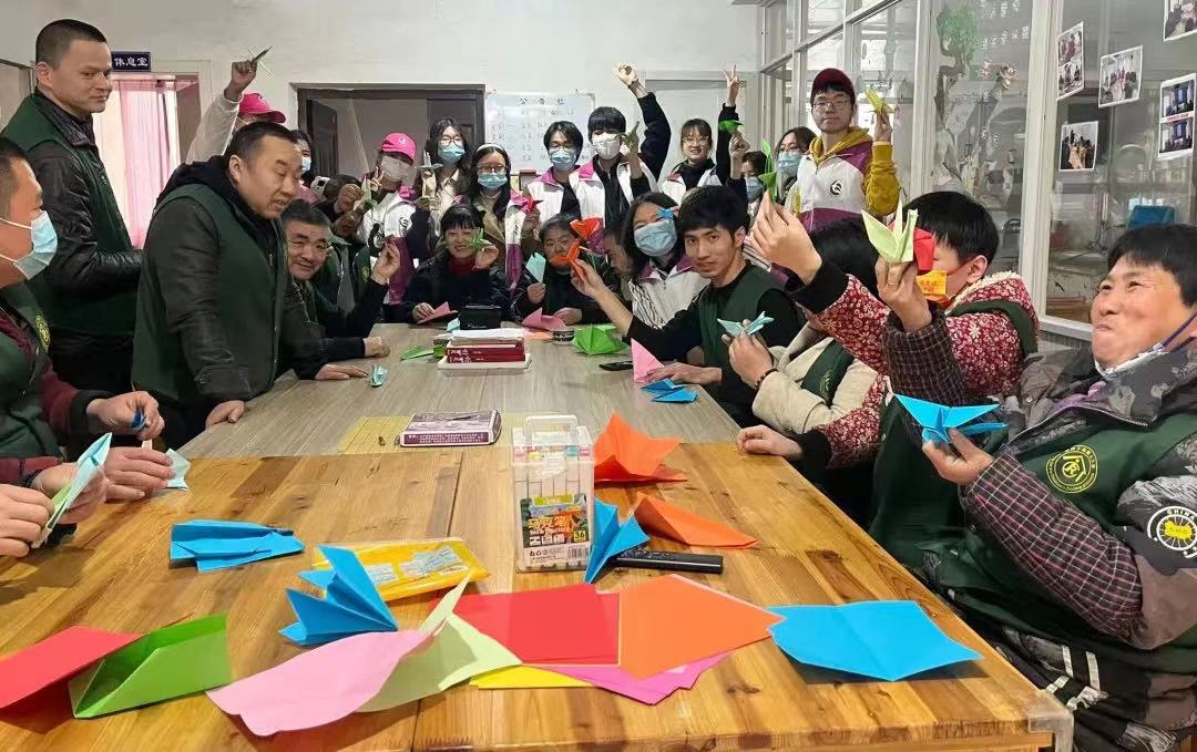 在活动的最后,志愿者与学员们一起折纸,五彩的纸飞机与千纸鹤承载着残疾人们乐观向上的生活态度,在阳光下熠熠生辉。
