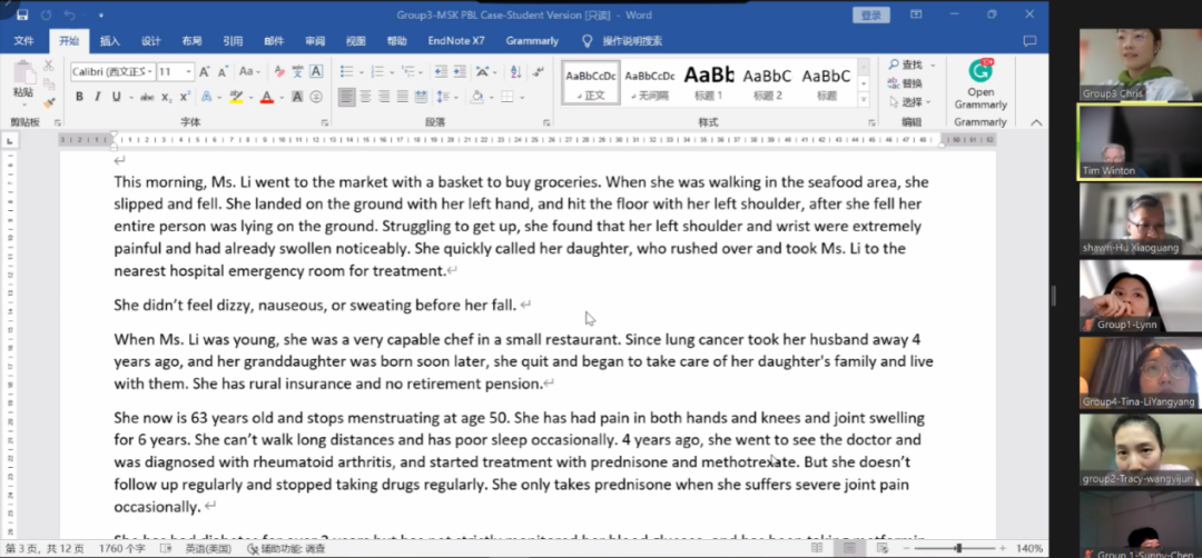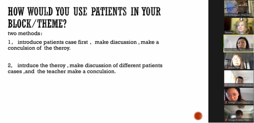 在最终展示前,每个小组都经历了初稿讨论、面对面改稿以及终稿模拟的三个阶段。首先,每组通过eClass在线学习平台提交了本组的PBL案例初稿,课程负责人卡尔·郝德森(Carol Hodgson)针对每组PBL文本撰写中的节奏问题、内容定位以及部分英语表述问题都与小组成员作了面对面的修改。中方老师在经指导前设计的基于问题的学习(PBL)案例往往在案例的开头便给出过于饱和的信息,使得学生可实现自主探究的范围变窄。针对此,卡尔老师建议,将更多的内容隐藏在学生针对病人的询问过程以及导师的辅助性提问过程中,从而引导学生们自主学习正确的问询过程。