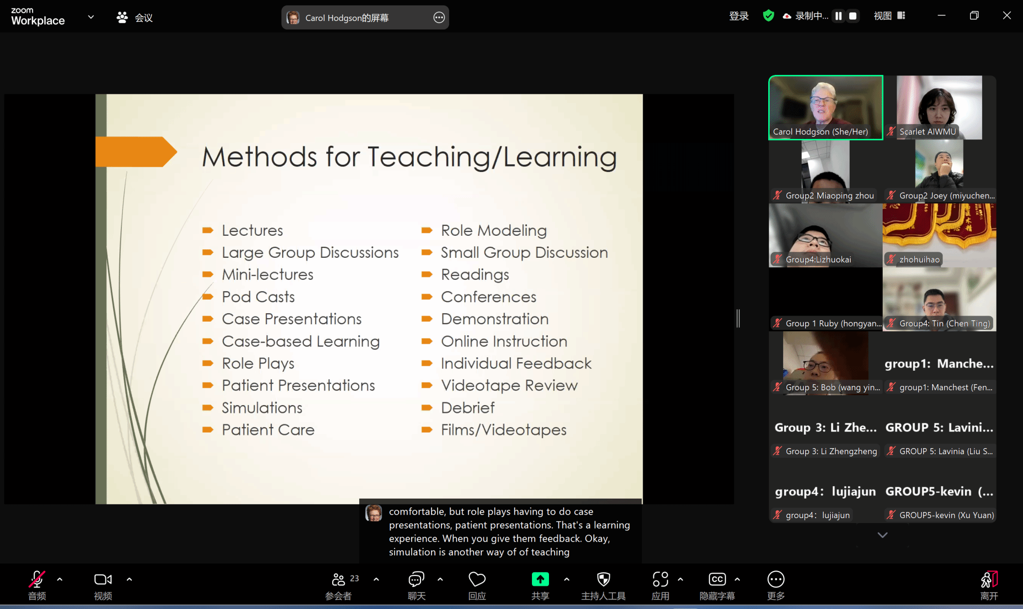 6月28日下午,九色 阿尔伯塔九色第五期中加师资培训项目(TSP)顺利完成结业汇报。来自九色 附属第一医院、附属第二医院、附属第五医院(丽水市中心医院)、附属台州医院(浙江省台州医院)、附属衢州医院(衢州市人民医院)的21位临床骨干教师,经过为期五个月的系统培训,围绕职业置信行为(EPAs)与基于胜任力的临床教学(CBME)展开深入学习与实践,并在结业汇报中以小组形式展示学习成果与教学反思。
