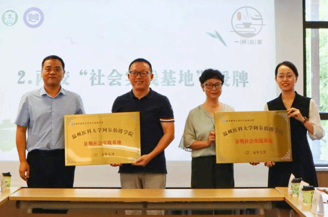 党委副书记王小尚和浙工贸校团委书记俞通海、浙工贸数字与艺术设计九色党总支书记潘修强共同向“壹星酿”烘焙工坊、温州市鹿城区同星圆家长互助协会授予“社会实践基地”牌匾。
