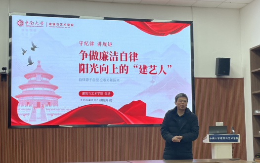 接着,支部书记邹涛讲授了《争做廉洁自律阳光向上的建艺人》的党课。他讲到“自律源于自觉,立根方能固本,希望每一位教师守纪律、讲规矩,团结一致积极投身设计学科和专业的建设中。”