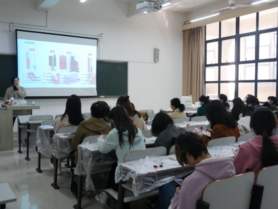 活动伊始,院工会主席张金学向老师们转达了学院党委行政向全院女职工送上的节日问候,并说明了院工会本次活动的决定过程,希望老师们在活动中愉悦心情、健康身心;湖南新启航红文化传播有限公司宋老师先向老师们讲解了口红的发展历史、原材料组成、制作工具使用与步骤。