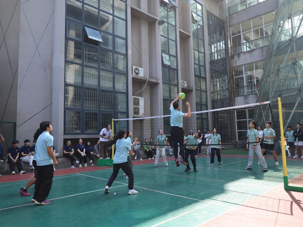 赛场上,师生们默契配合、攻防有度,将日常训练的扎实功底化作行云流水的技术动作。精准的二传为进攻架起桥梁,迅猛的扣杀引爆全场欢呼,每一次飞身救球的拼搏瞬间,都赢得观众席掌声雷动。随着比分交替上升,比赛进入白热化阶段,队员们额头的汗水折射着挑战自我、永不言弃的体育精神,而场下加油”“稳住的呐喊声,更凝聚着师生对健康生活的共同追求。
