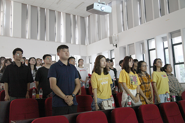 六点五十分,庄严而又神圣的国旗由英姿飒爽的列队护送进场。仪式伊始,我院学子李利民、张维斯、孟乡、曹殷姿、陆思童、张镓铄、吴赛、张逸帆深情地演唱了一首令人心生自豪的歌——《我和我的祖国》, 随后又演唱了《共筑中国梦》,唱出了对祖国母亲的热爱。