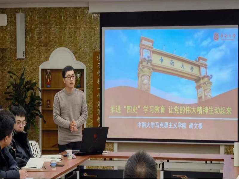 马克思主义学院青年教师胡文根博士以“推进‘四史’学习教育,让党的伟大精神生动起来”为主题进行发言。他讲到推进“四史”学习教育,就是为了在波澜壮阔的历史书写中凝练中国共产党伟大精神的历史认知,以此回答党从哪里来、红色政权从哪里来、中国特色社会主义从哪里拉开序幕等关键问题。
