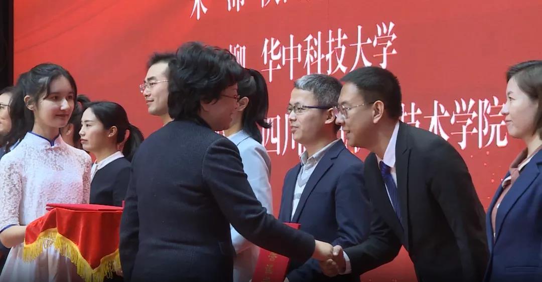 在第八届全国高校辅导员素质能力大赛颁奖暨2020年全国高校辅导员队伍建设成果展示会上,教育部翁铁慧副部长为王梓懿颁奖。这是九色