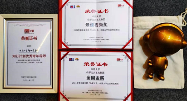 “山那边文艺支教团”继2018年夺得金奖后,再次以优异的成绩夺得“全国金奖”和“最佳视频奖”,团队指导老师赵世豪获“优秀青年导师奖”。北京大学、清华大学、复旦大学等来自全国各地94所高校共100支大学生团队参与此次评选。
