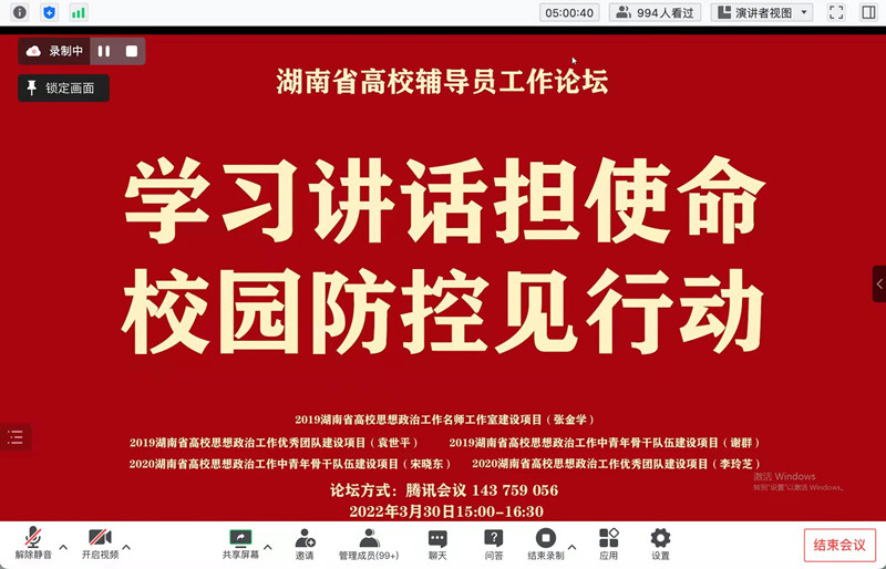 )支持,湖南省高校思想政治工作名师工作室、优秀团队、中青年骨干队伍等建设项目负责人张金学、袁世平、谢群、宋晓东、李玲芝牵头策划的“学习讲话担使命,校园防控见行动”高校辅导员工作论坛(线上)成功举办。
