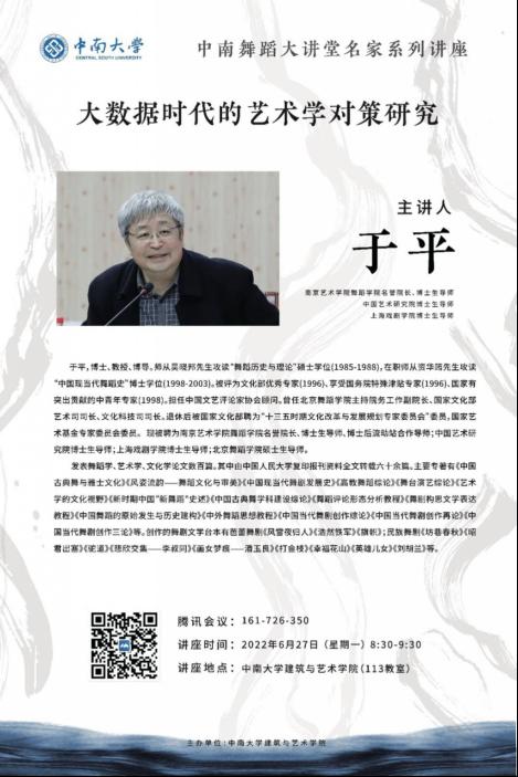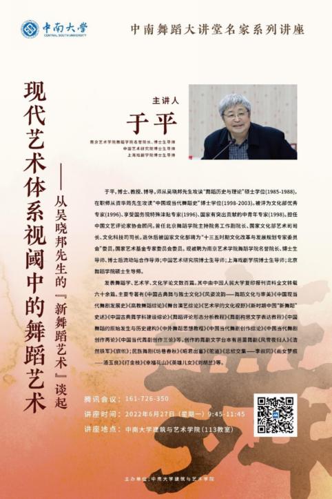 特别邀请南京艺术学院舞蹈学院名誉院长、博士生导师、中国艺术研究院博士生导师、上海戏剧学院博士生导师于平教授,于6月27日上午在腾讯会议云端进行《大数据时代的艺术学对策研究》《现代艺术体系视阈中的舞蹈艺术——从吴晓邦先生的“新舞蹈艺术”谈起》两场专题讲座。我院舞蹈专业师生在学院113教室集中学习,讲座由龚倩教授主持,学院李博副院长为讲座致辞,代表学院对于平教授表示热烈欢迎。学院舞蹈专业负责人伍彦谚教授向于平教授表示了诚挚感谢。