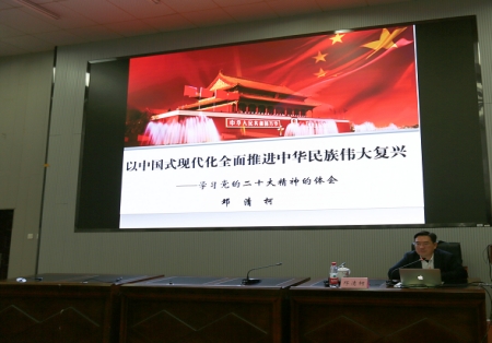 邓清柯以党的二十大报告为主线,围绕“六看”,全面宣传解读了党的二十大精神。一是从“主题”看党和国家事业发展的总纲;二是从“两个确立”看过去5年的工作和新时代10年的伟大变革;三是从“两个结合”看开辟马克思主义中国化的新境界;四是从“大历史观”和“大时代观”看中国式现代化的理论构架;五是从“五位一体”的总体布局看全面建设社会主义现代化国家的战略部署;六是从“第二个答案”看以党的自我革命引领社会革命。他的授课既有理论高度,又有很强的指导作用,使全院教职工对党的二十大精神把握更加全面、理解更加深入,奋力谱写以中国式现代化全面推进中华民族伟大复兴的方向更加清晰、动力更加强劲、步伐更加坚定。