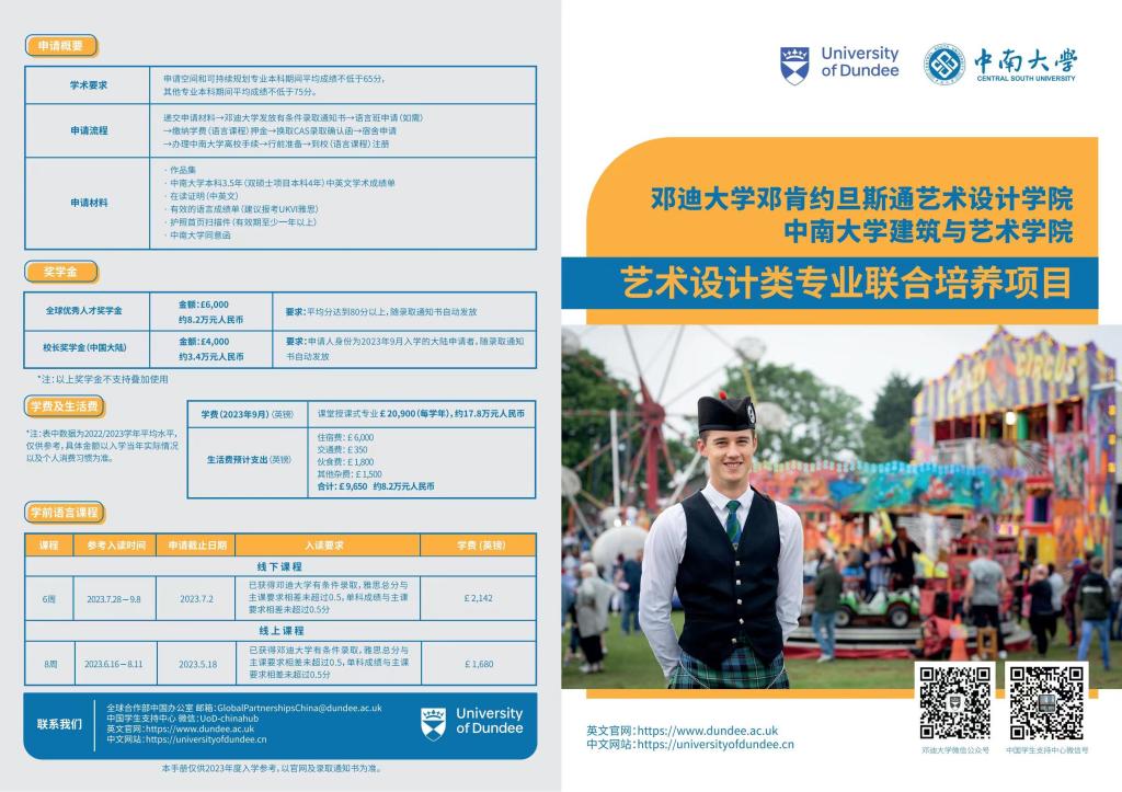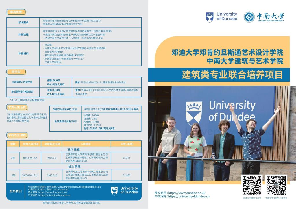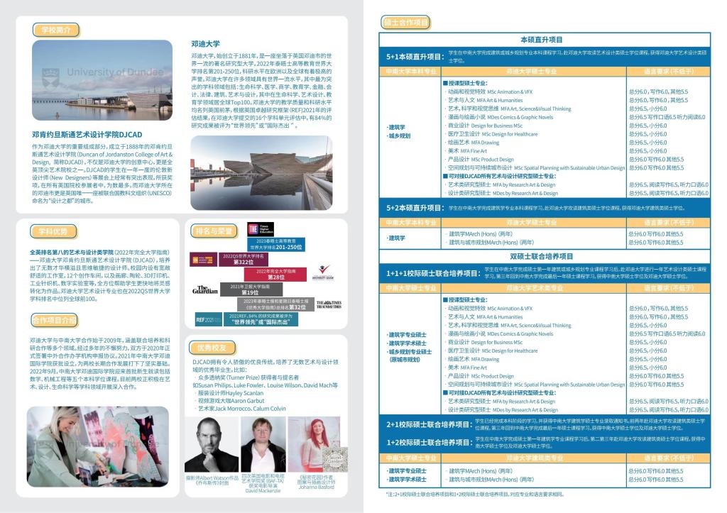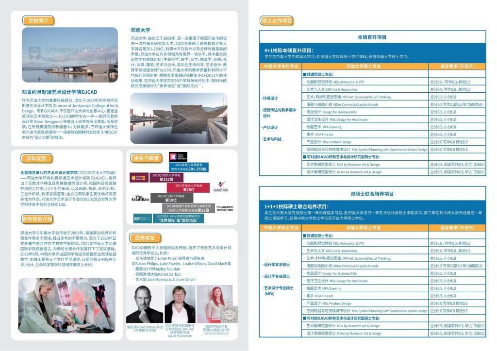 与邓迪大学艺术设计学院的本科与硕士阶段学生联合培养,涵盖建筑学、城乡规划、环境设计、视觉传达设计、产品设计、艺术与科技等专业方向。