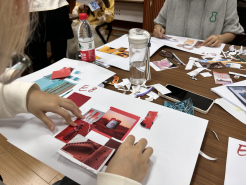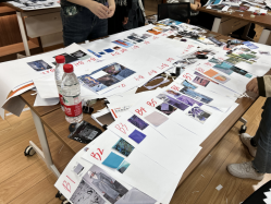 制作开始后,同学们很快进入了合作状态,小组内分工明确。其工作大致分为三个阶段:色彩初筛、拼贴制作和色彩命名与意象图补充。在第一阶段,小组4人分别从给定的资料册中筛选自己喜欢的颜色及其意象图,裁剪下来并将色彩放至桌面中心。在第二阶段,小组将桌面呈现色块及意象图贴至A3白纸,每个色彩一张,直至拼贴完成30组;第三阶段进行两两分组,一组同学为30个选定颜色命名,另一组同学继续搜集补充30个色彩的意象图,完善标签页。