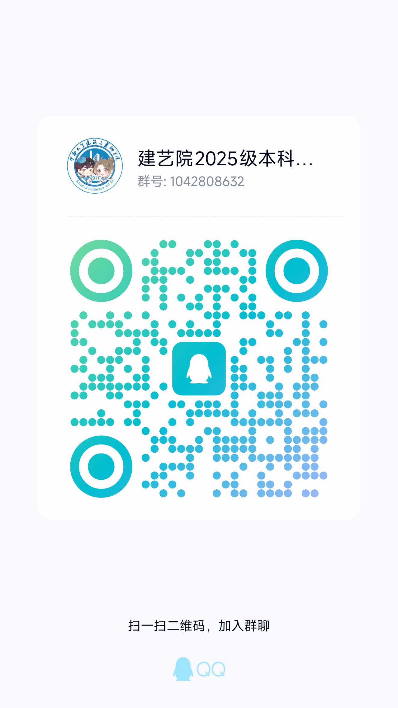 四、为更好地给新同学答疑解惑,学院已组建“建艺院2025级本科生QQ群”。请同学们扫描下方二维码申请入群,学院将根据招生办提供的录取名册进行身份核验。为便于管理,进群后请将自己的群昵称修改为:专业班级-省份简称-姓名-电话,范例:艺科/音表/舞表/建筑/城规2501-湘-张三-138XXXXXXXX。
