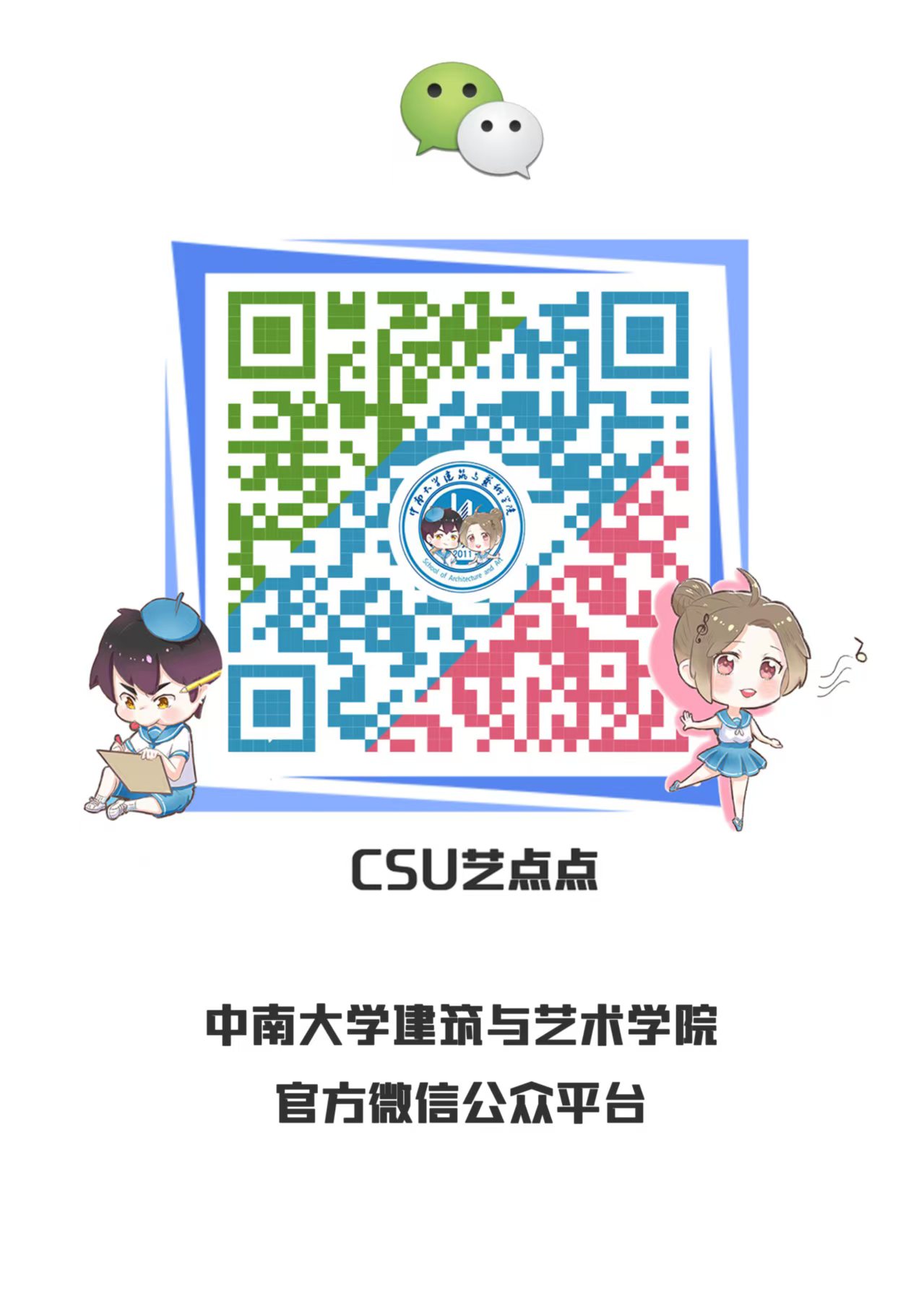 官方微信公众号“CSU艺点点”。学院关于新生报到等重要通知和资讯,将会在“CSU艺点点”平台同步发布。