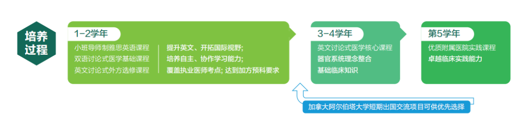 专业学制5年。1-2学年通过特色英语课程、讨论式医学基础课程、英文选修课程,提升英文、开拓视野,夯实专业基础知识、培养自主学习及协作沟通能力。3-4学年开设外方师资授课为主的医学核心课程,整合基础临床知识,培养系统思维。第5学年依托高水平附属医院平台,理论联系实践、强化卓越临床技能。