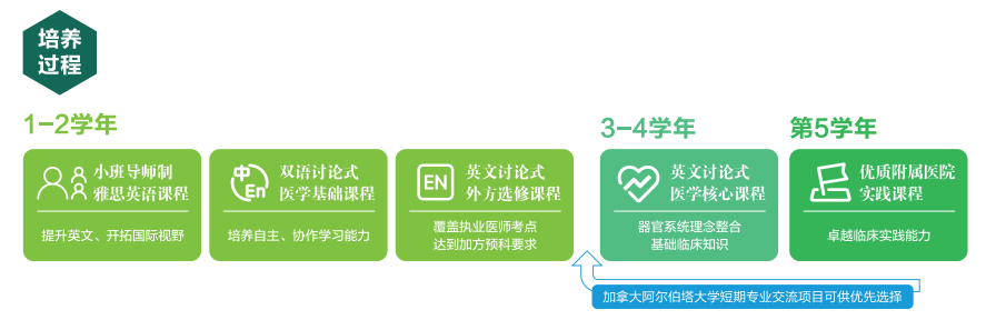 专业学制5年。1-2学年通过特色英语课程、讨论式医学基础课程、英文选修课程,提升英文、开拓视野,夯实专业基础知识、培养自主学习及协作沟通能力。3-4学年开设外方师资授课为主的医学核心课程,整合基础临床知识,培养系统思维。第5学年依托高水平附属医院平台,理论联系实践、强化卓越临床技能。